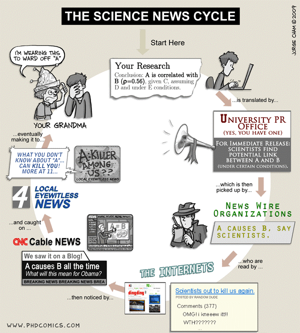 Science communication plays an integral role in bridging the gap between academia and the public. Science writers have the tricky job of distilling complex ideas into digestible pieces, and explaining highly-specialized experiments in a way the public might find interesting. Research highlighted in the media can become part of a larger cultural conversation and have a more direct impact on people’s lives. However, in this process, a research article undergoes multiple reinterpretations, and can become detached from the original material. As a result of this process, science for public consumption tends to overemphasize human relevance, lose qualifiers or context, and frequently employs ‘click-bait’ methods of choosing catchy titles that distort the results and implications of the research.